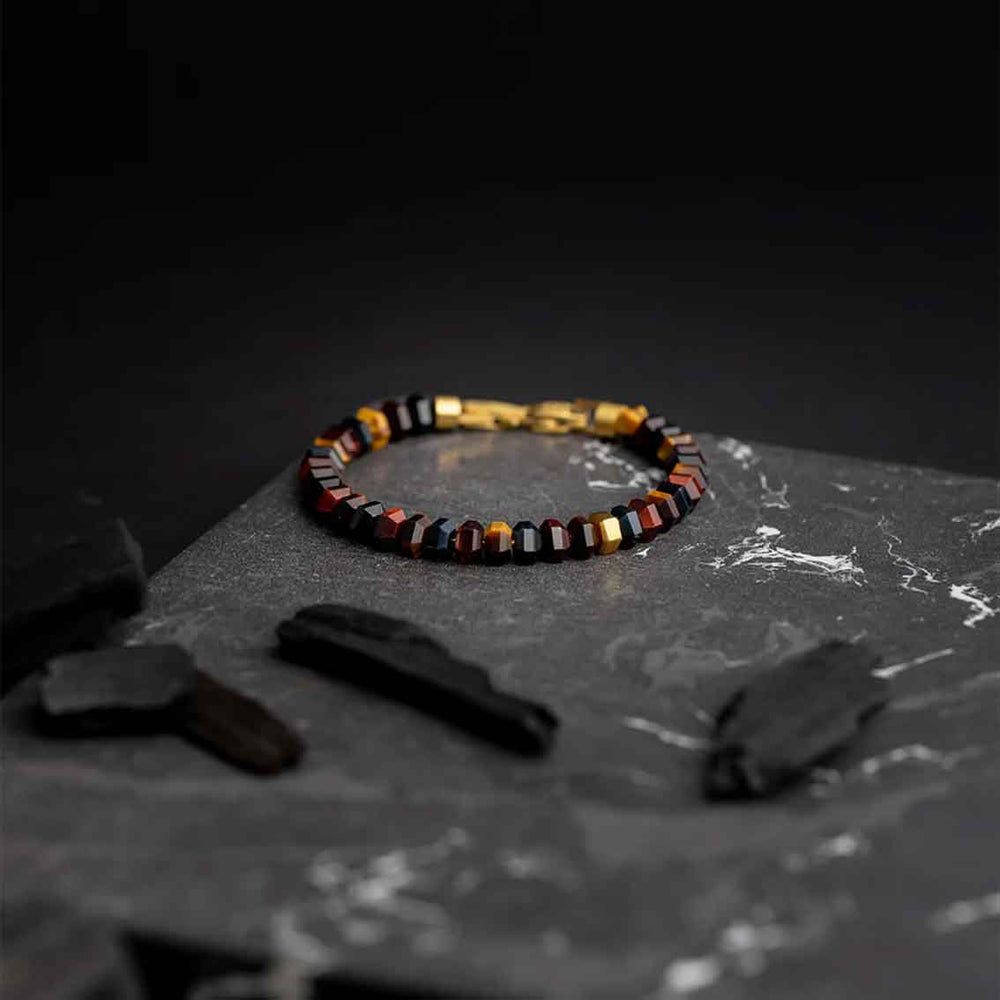 Das Octo 3 Colors Armband von Gemini ist eines der Prunkstücke der Kollektion. Die achteckigen Natursteine für dieses Armband werden von professionellen Handwerkern von Hand bearbeitet. Das Armband ist mit Titan, Stahl und einer 18-karätigen Vergoldung versehen. Die verschiedenen Elemente gehen nahtlos ineinander über und machen dieses Armband zu einem weltweit einzigartigen Armband. Dieses Armband besteht aus Tigerauge-Steinen, die oft als Kriegerstein bezeichnet werden. Es ist ein kraftvoller Stein, der Sie vor negativen äußeren Einflüssen schützt. Außerdem soll es Mut, Kraft und Ausdauer steigern. Länge 20-21 cm