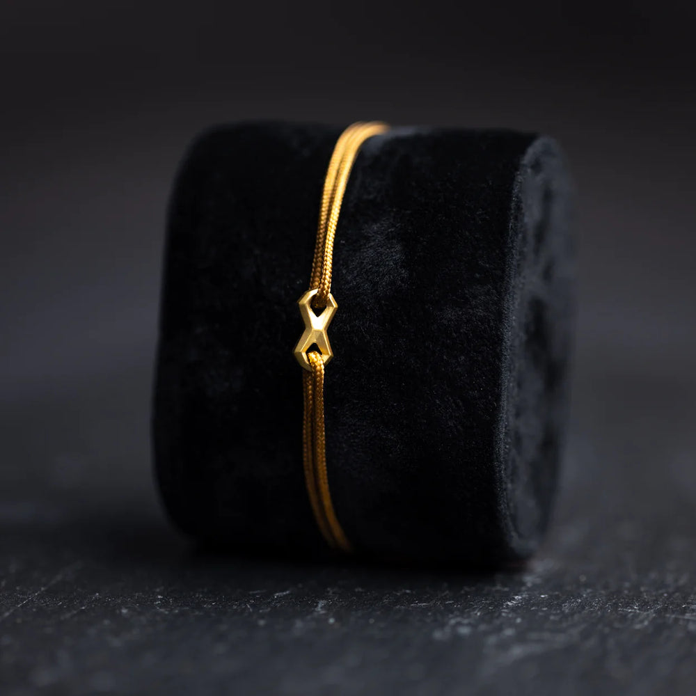 Das Infinity Brown Gold-Armband vergoldet ist ein 1,5 mm dickes braunes Nylonarmband mit einem vergoldeten Unendlichkeitszeichen aus Titan der Güteklasse 2.