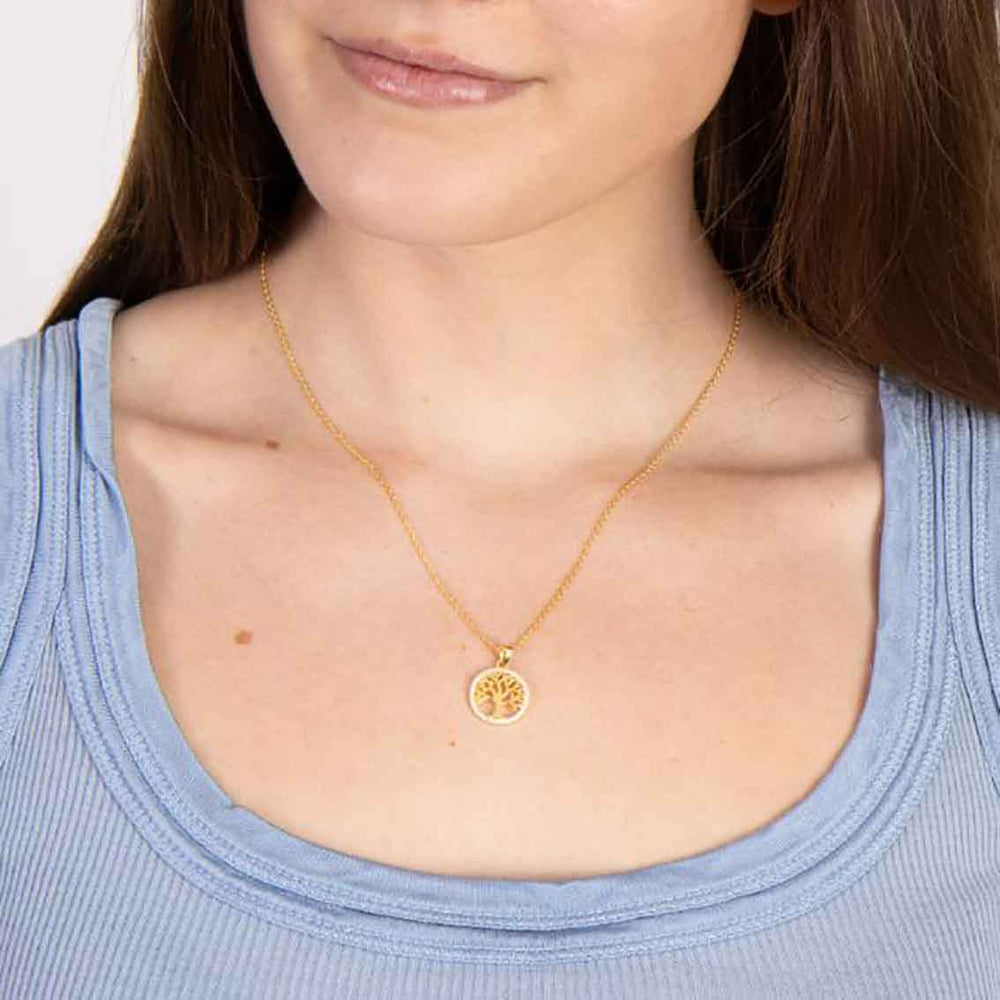 Der Anhänger, 15 mm, zeigt den Baum des Lebens, umrandet von einem Ring aus kubisch Zirkonia, welche der Halskette einen femininen Touch verleihen. Die beiliegende Halskette aus vergoldetem Silber misst 42 cm, plus weiteren 3 cm zur Justierung der Länge.