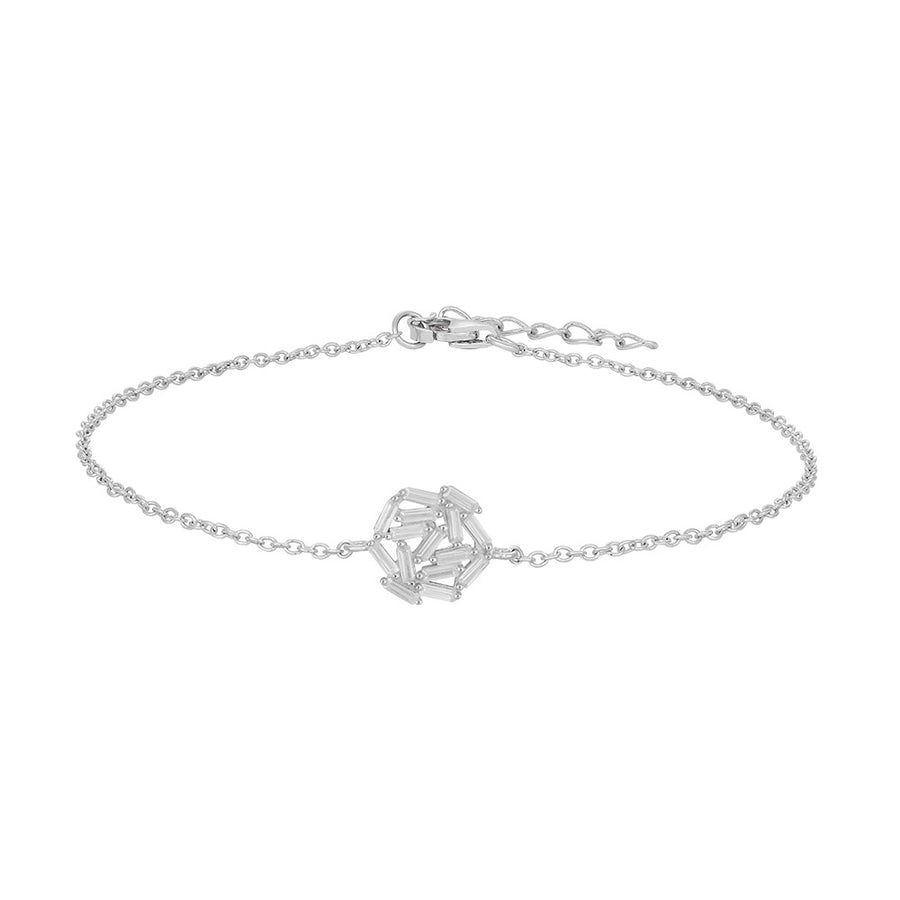 Das Armband in rhodiniertem Silber aus unserer BessNor Serie ist ein Schmuckstück besetzt mit kubischen Zirkonia im Baguetteschliff, angeordnet in einem runden Cluster. Das verleiht dem klassischen Kreisschmuck einen einzigartigen Twist.