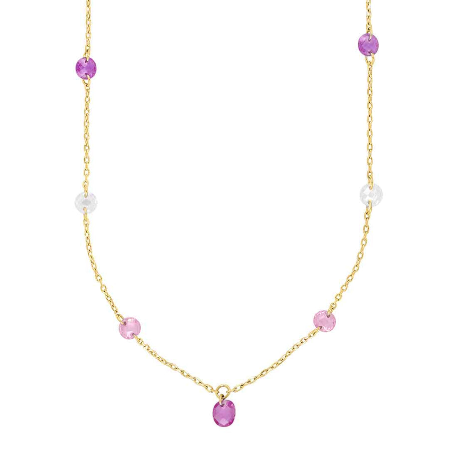 Die Halskette ist aus 18 Karat vergoldetem Silber und misst 42 cm mit einer zusätzlichen Länge von 3 cm zum Verstellen. Die schönen Steine sind aus Zirkonia. Der rosa Anhänger ist 6 mm hoch und 4 mm breit.