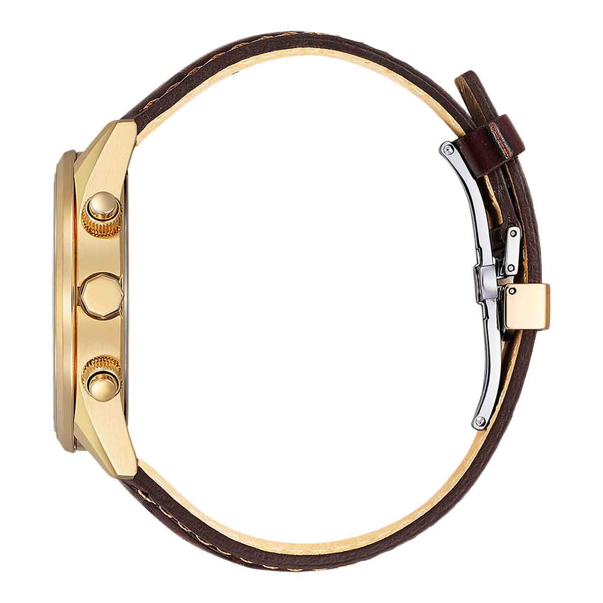 Eleganter Funk-Chronograph mit goldfarbenem Edelstahlgehäuse und dunkelbraunem Lederarmband, Kristallglas und anthrazitfarbenem Zifferblatt. Ausgestattet mit dem Kaliber H800 mit Eco-Drive Lichtantrieb, Funkempfang, Weltzeit, Stoppuhrfunktion, 24h Anzeige, Datum und 10 bar Wasserdichtigkeit. Gehäusedurchmesser: 43 mm, Bandanstoß: 22 mm.
