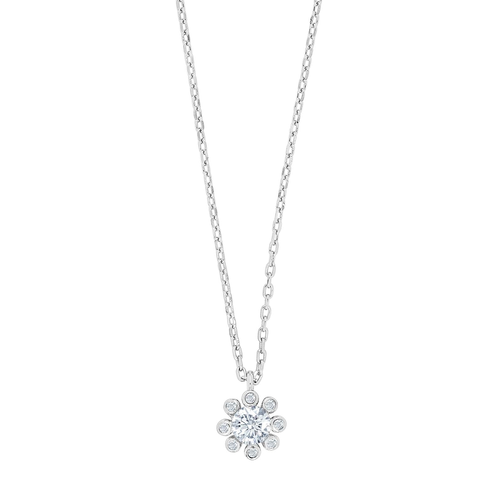 Schöne und feminine Halskette mit einem großen Zirkonia-Stein in der Mitte, umgeben von acht kleinen, gestaffelten Zirkonia. Zusammen bilden die funkelnden Steine ein feines Blumen-Motiv – von der Natur inspiriert und zeitlos elegant.