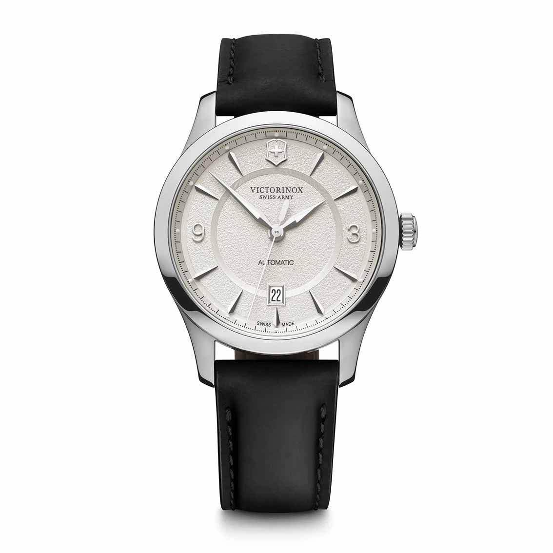 Klassische Uhr von Victorinox im zeitlosen Design für jeden Anlass, automatisches Uhrwerk, Kaliber ETA 2892, hergestellt in der Schweiz, auf der Gehäuserückseite sichtbar. 42-Stunden-Gangreserve, leicht lesbare Ziffern; Indizes und Zeiger mit Super-LumiNova.