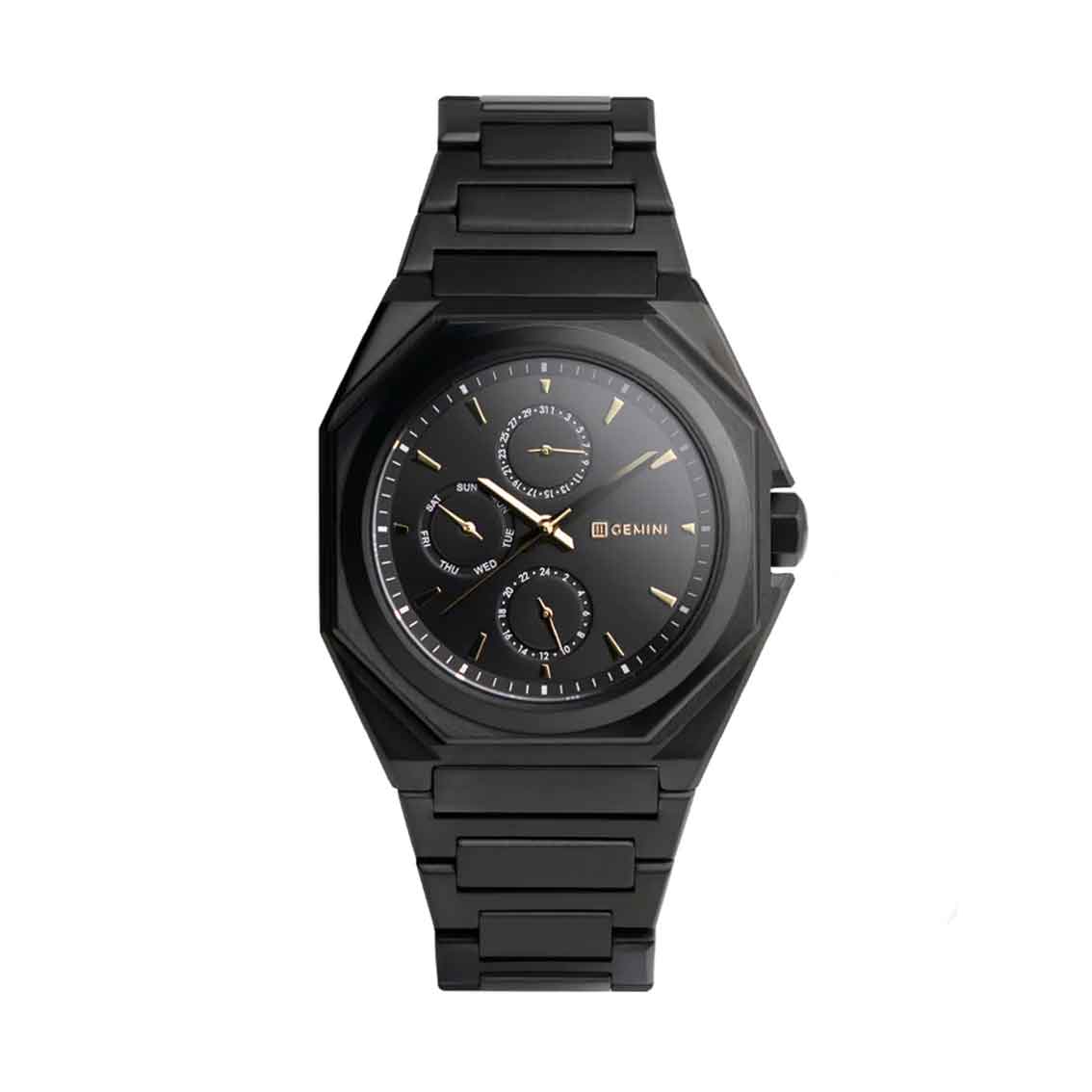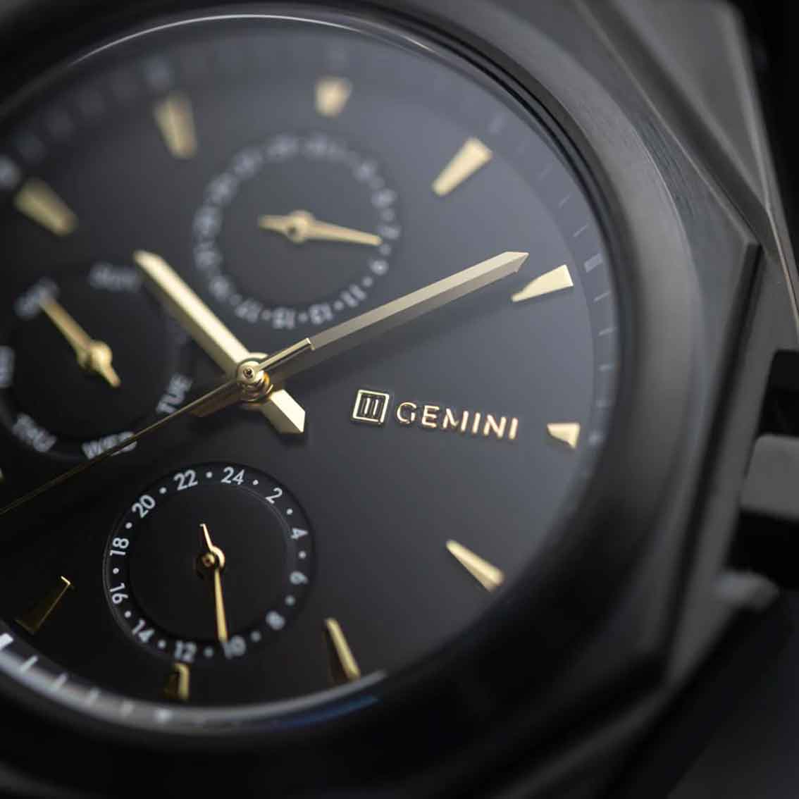 Diese Uhrenserie von Gemini besteht aus Modellen mit Gehäuse und Armband aus Edelstahl 316L. Die achteckige Form wird mit runden Elementen kombiniert, um eine schöne Tiefe zu erzeugen. Die goldenen Elemente schaffen einen markanten Akzent zu den tiefschwarzen Elementen und runden und achteckigen Formen. Das schwarze Stahlarmband und das Gehäuse wurden gebürstet, wodurch ein luxuriöser Look entsteht. Im Inneren schlägt ein japanisches Miyota-Interieur in höchster Qualität.