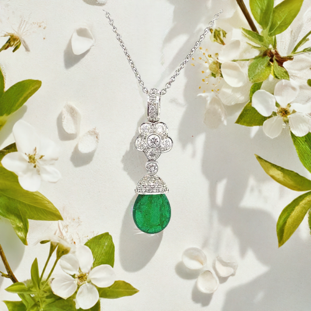 Dieser außergewöhnliche Anhänger vereint die faszinierende grüne Pracht eines natürlichen Smaragd-Tropfens mit der Brillanz von Diamanten. Der edle Smaragd von 2,07 Karat wird von einer exquisiten Fassung aus 585 Weißgold (14k) mit 0,39 Karat Brillanten elegant in Szene gesetzt – ein wahres Meisterwerk der Schmuckkunst.